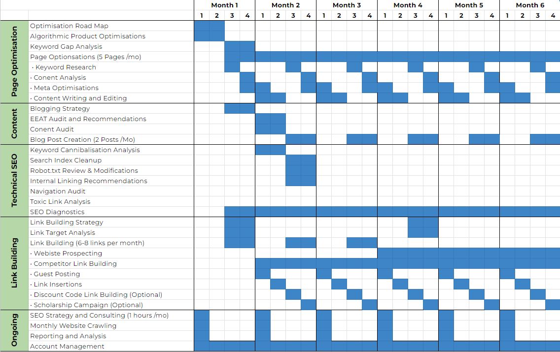 Every site has different needs so our process starts with a full crawl of your website to identify the technical issues that will need fixing and we then outline a 6 month road map for the full optimization of your site.
